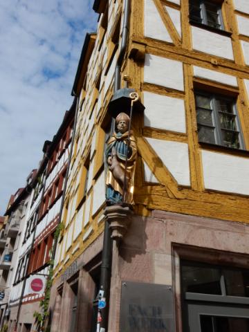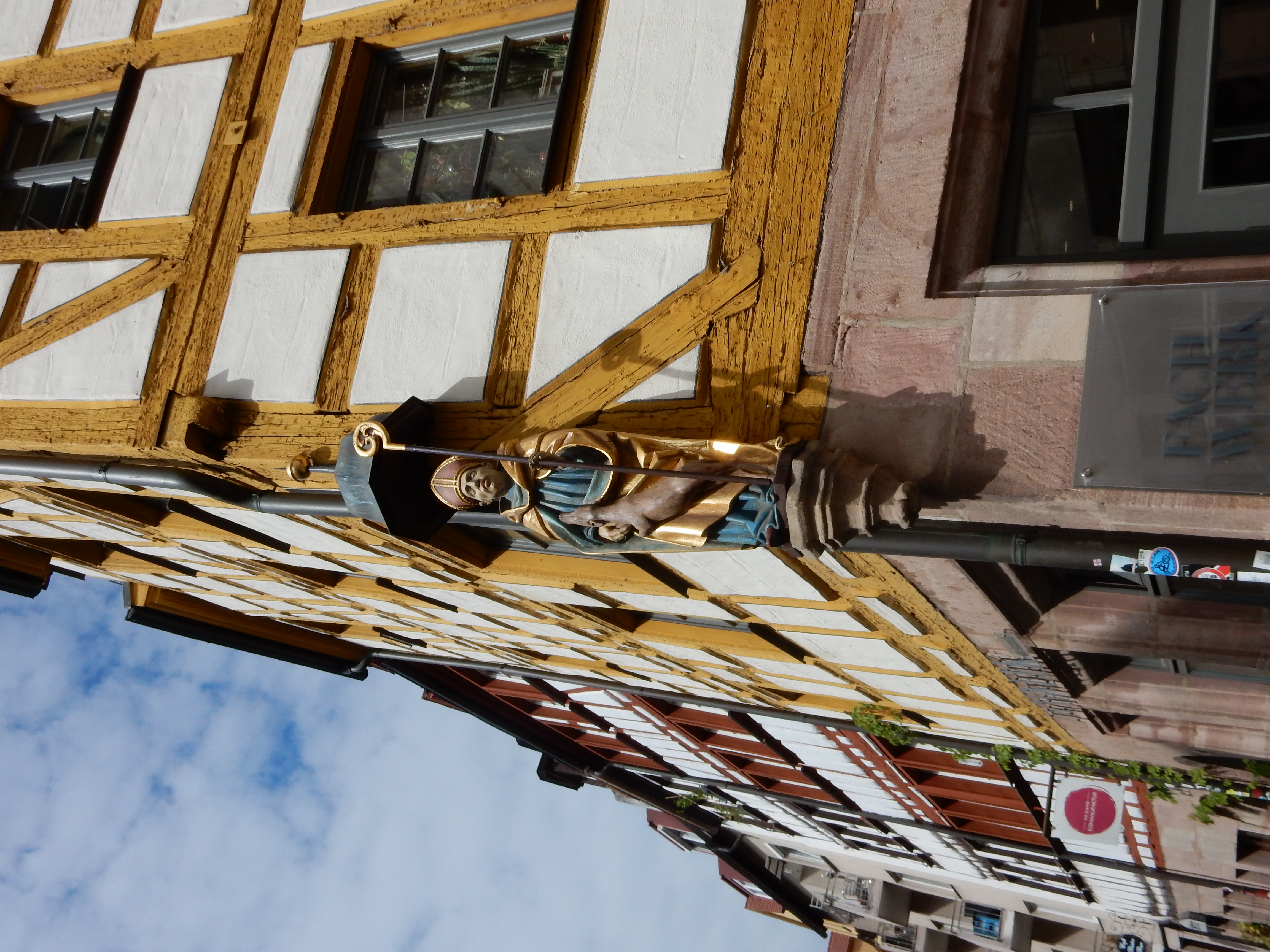 Bishop and dog on half-timered house on Weißgerbergasse |